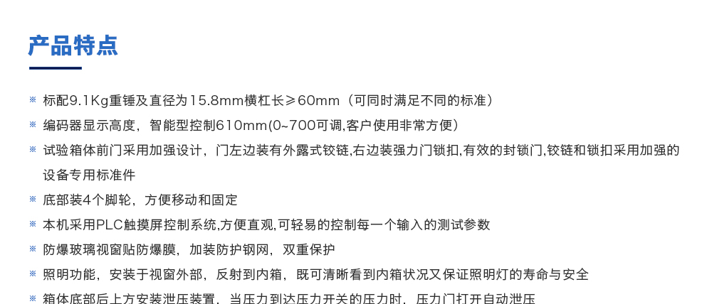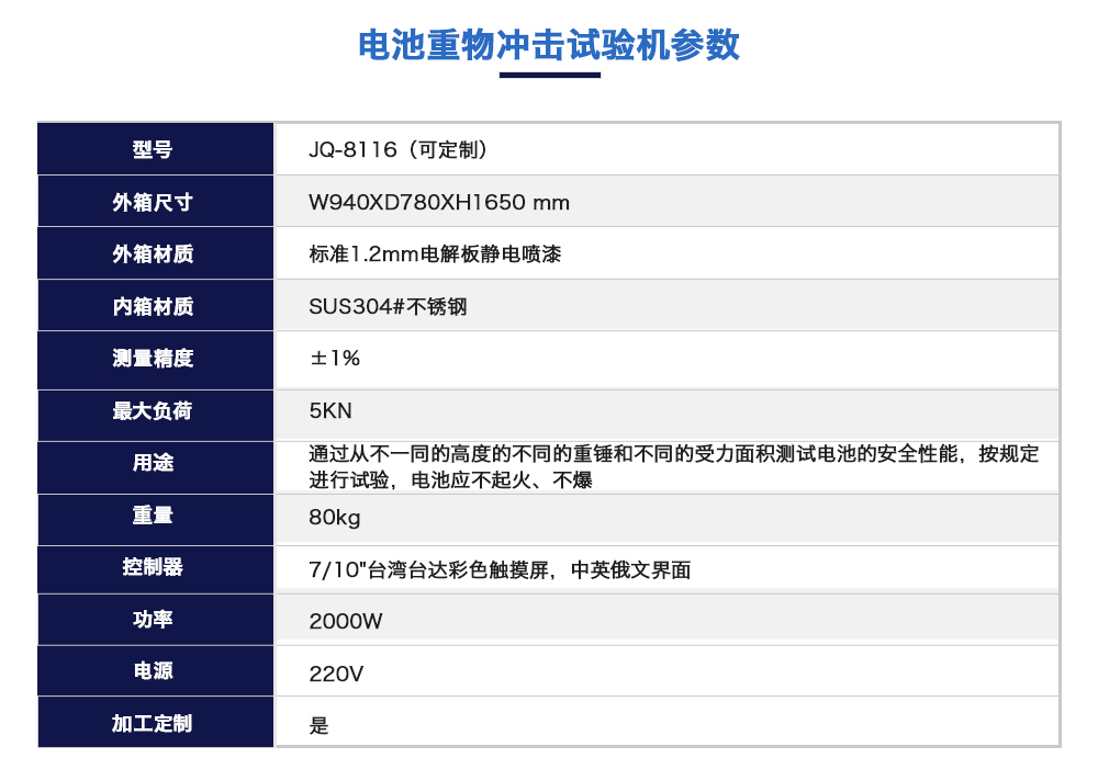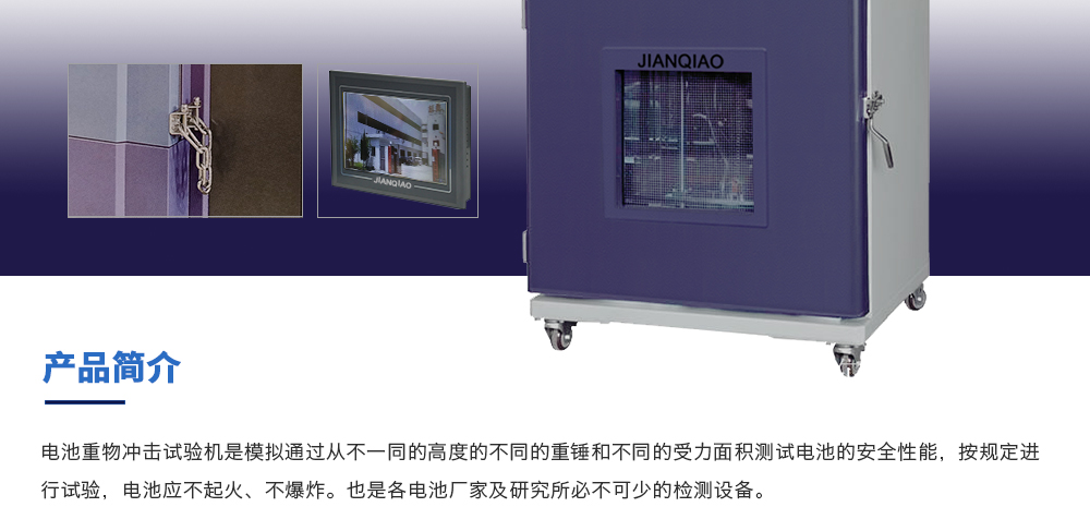用途:電池重物沖擊試驗(yàn)機(jī)是模擬通過從不一同的高度的不同的重錘和不同的受力面積測試電池的安全性能,按規(guī)定進(jìn)行試驗(yàn),電池應(yīng)不起火、不爆炸。也是各電池廠家及研究所必不可少的檢
