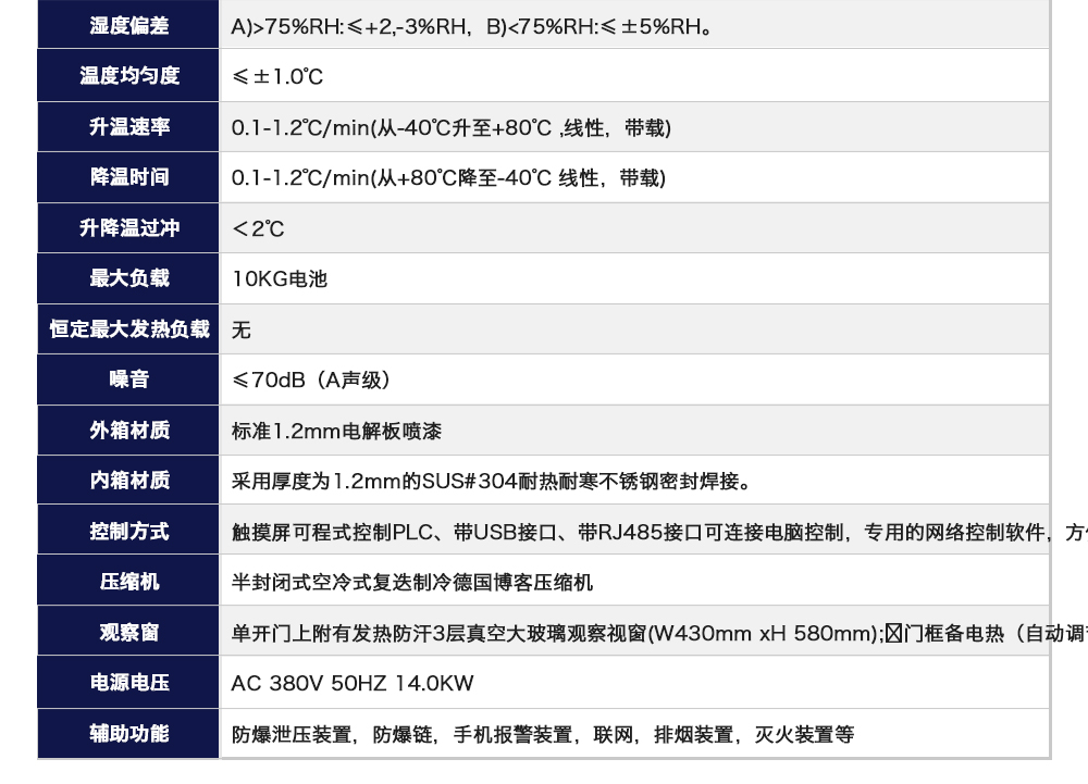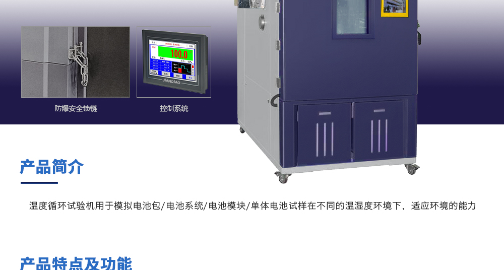 用途:溫度循環(huán)試驗機用于模擬電池包/電池系統/電池模塊/單體電池試樣在不同的溫濕度環(huán)境下,適應環(huán)境的能力