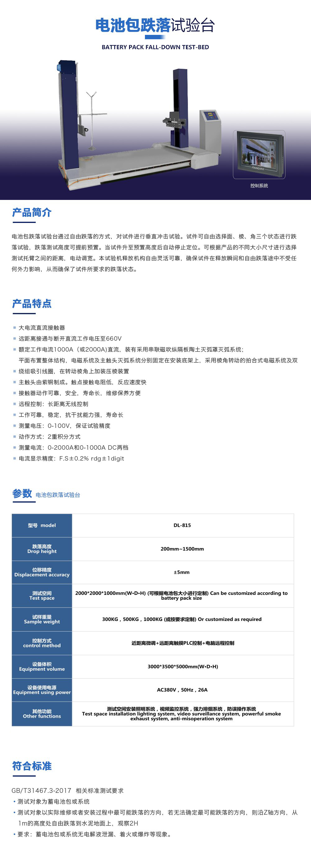 用途:電池包跌落試驗臺通過自由跌落的方式,對試件進行垂直沖擊試驗。試件可自由選擇面、棱、角三個狀態(tài)進行跌落試驗,跌落測試高度可提前預(yù)置。當試件升至預(yù)置高度后自動停止定位