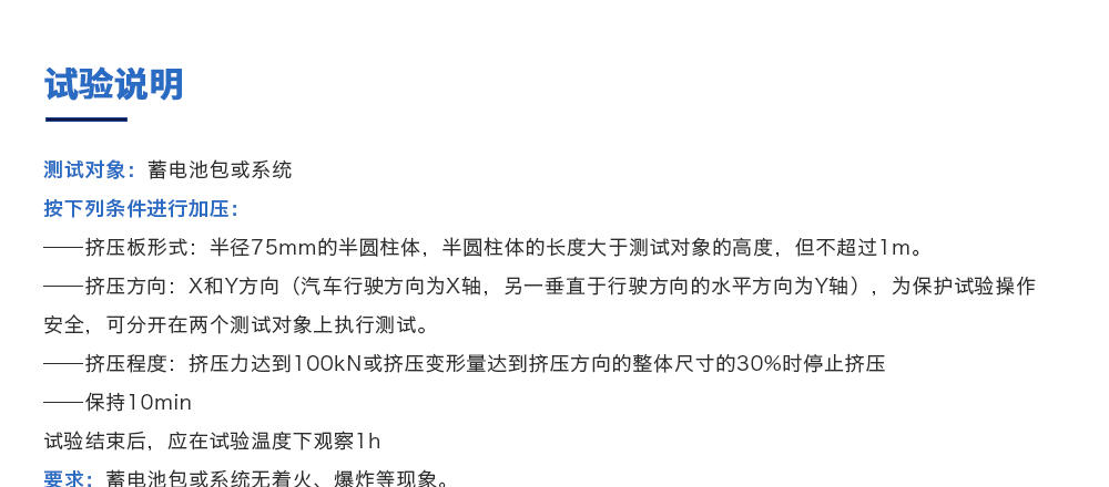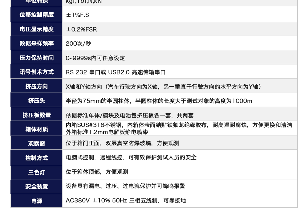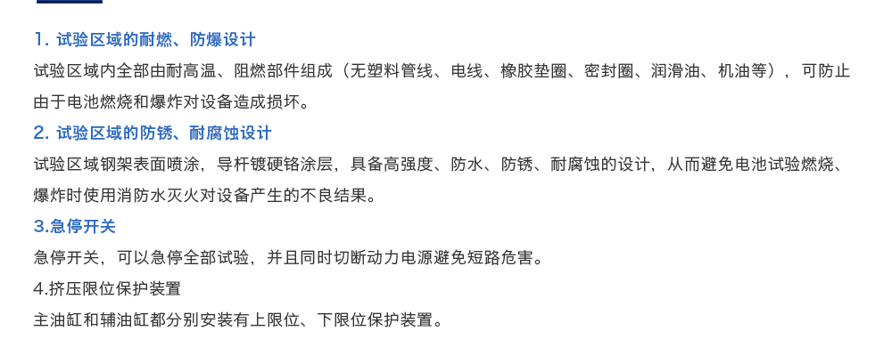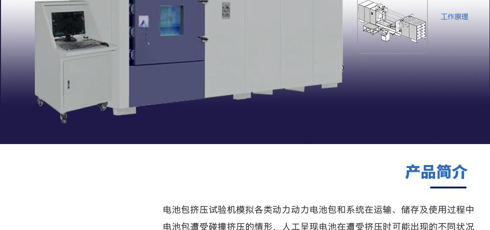 用途:電池包擠壓試驗機(jī)模擬各類動力動力電池包和系統(tǒng)在運輸、儲存及使用過程中電池包遭受碰撞擠壓的情形,人工呈現(xiàn)電池在遭受擠壓時可能出現(xiàn)的不同狀況。